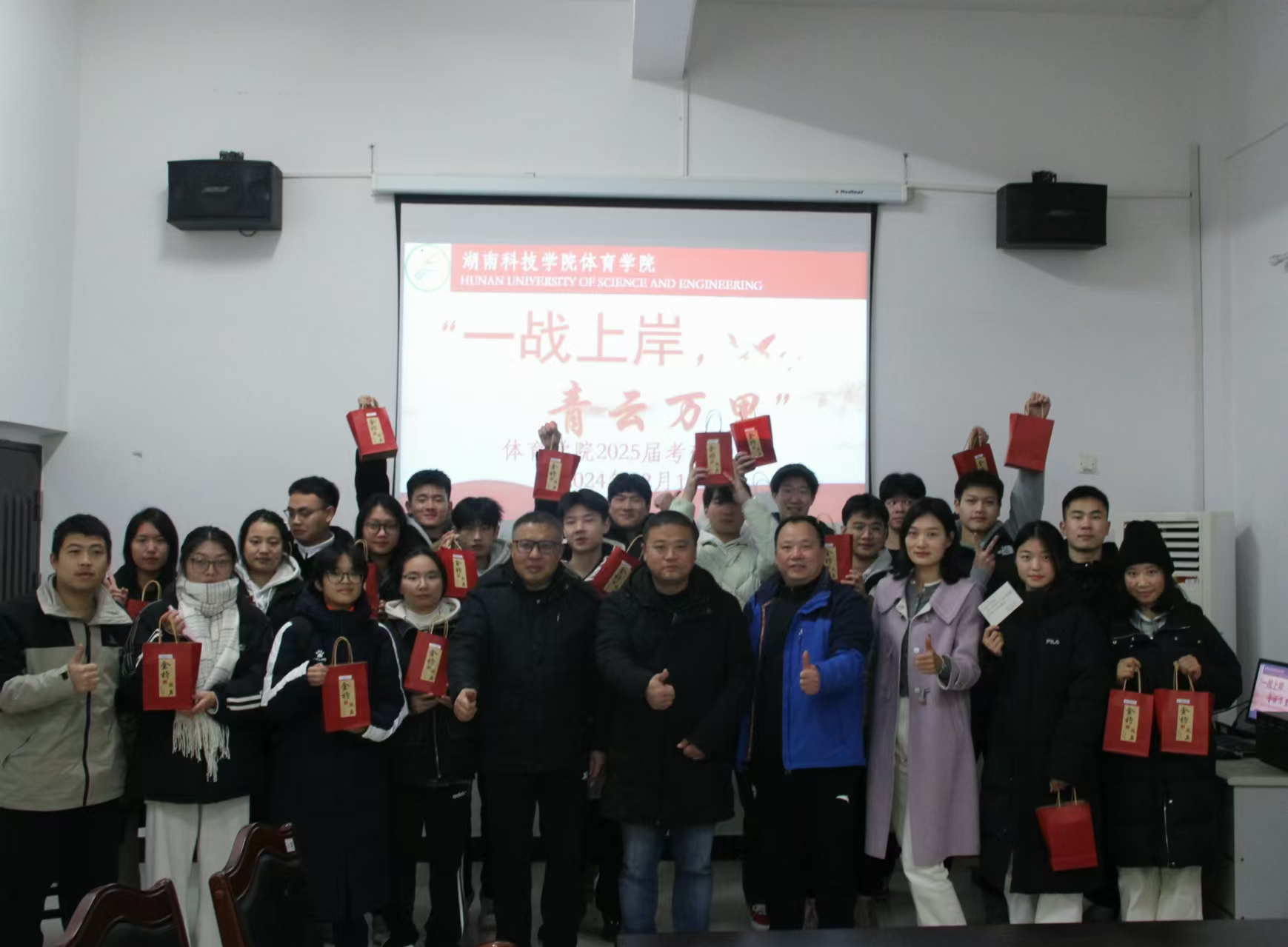 本网讯(通讯员 吴迪 蒋幸坊)12月13日,体育学院举办了“一战上岸,青云万里”2021级学生考研慰问活动。体育学院院长谢欢、党总支书记陈泽顺、副院长李红云以及辅导员共同参加活动,为即将踏上考场的学子们送上祝福与关怀。