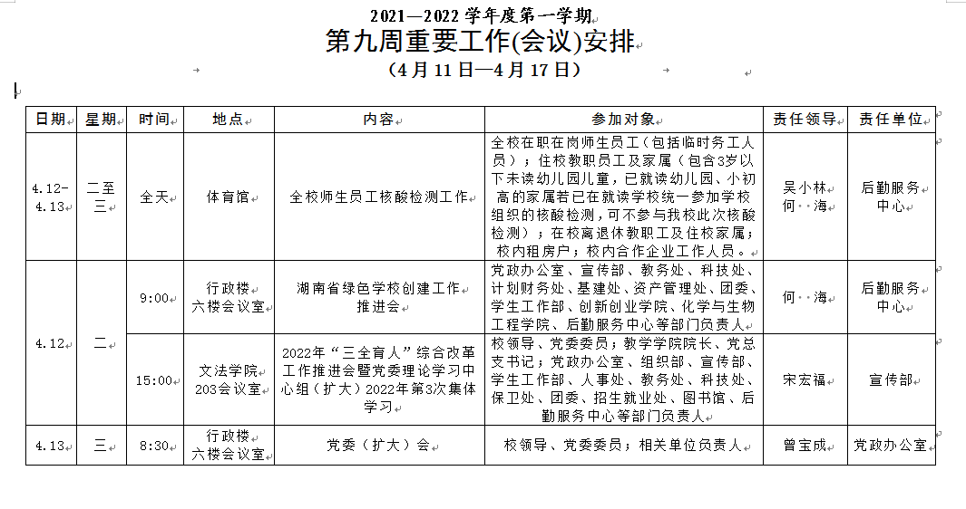 [党政办]第九周重要工作(会议)安排 (4月11日—4月17日)